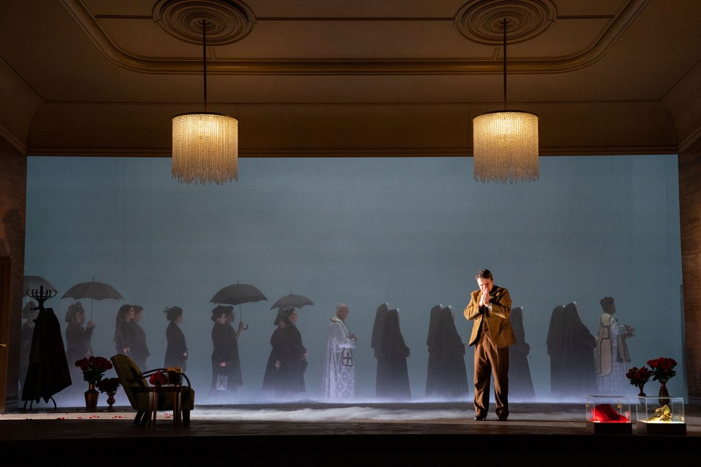 It was an enrapturing performance and production. Still, I would say it is one of those works that misses greatness ‘by a hair’ (to borrow from Mencken’s verdict on Mendelssohn). The music was always extraordinarily good, especially with its indulgent, brilliant harmonies. But the libretto creaks along with some pacing issues, and at nearly three hours the opera may be overlong. The sheer length and scale of the opera also creates a contradiction: everything happens in the one room, yet the music is even bigger, more luscious, and more soaring than Puccini. I left undecided whether this wholly worked (partly for reasons I’ll explain in a moment) — though it had an undeniable and irresistible power.
